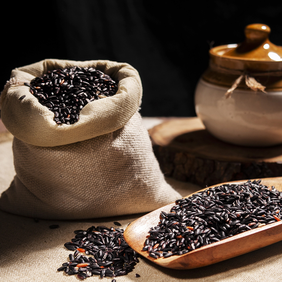 Black rice, which is also known as forbidden rice, is healthier than white rice. This is because in the milling process of white rice, the husk, bran, and germ are removed, thus stripping away the protein, fibre and other essential nutrients of white rice. Whereas in the milling process of the black rice fibre and vitamin-rich outer layer (bran) and its nutritious underlying fatty layer are not removed. Therefore, black rice has more protein, fibre and vitamin E antioxidants as compared to white rice.